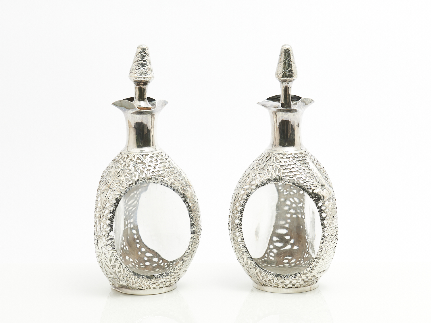 A PAIR OF CHINESE EXPORT SILVER-CLAD GLASS DECANTERS, USING HAIG'S 'DIMPLE' BOTTLES H.28CM, LEONARD JOEL DELIVERY SIZE: MEDIUM