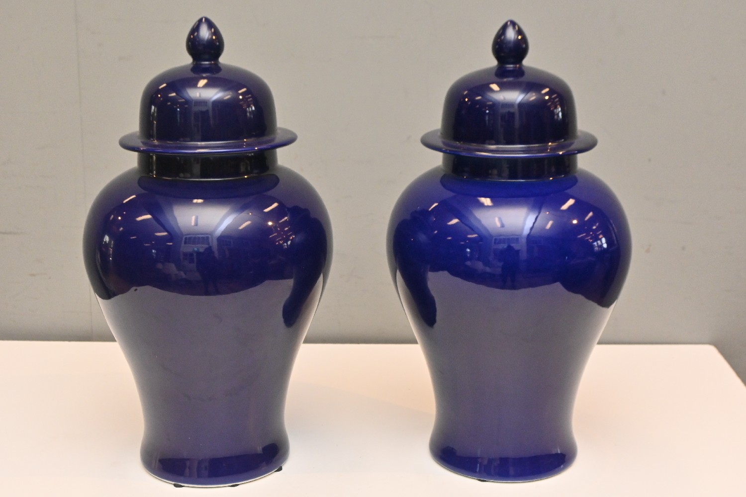 A PAIR OF BLUE GLAZED CERAMIC JARS (58H X 33D CM) (LEONARD JOEL DELIVERY SIZE: LARGE)