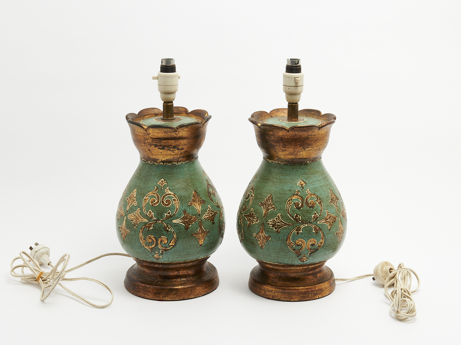 A PAIR OF FLORENTINE PAINTED AND GILDED TERRACOTTA LAMPS H.42CM, LEONARD JOEL DELIVERY SIZE: MEDIUM