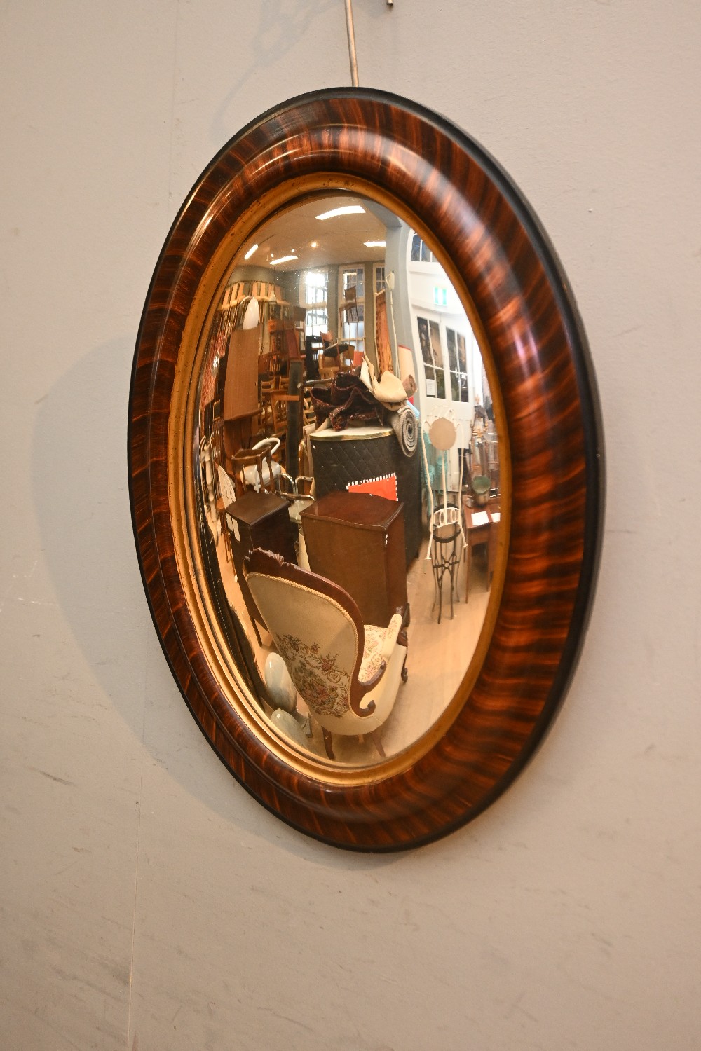 AN OVAL WALNUT FRAMED CONVEX WALL MIRROR (47H X 62W CM) (LEONARD JOEL DELIVERY SIZE: MEDIUM)