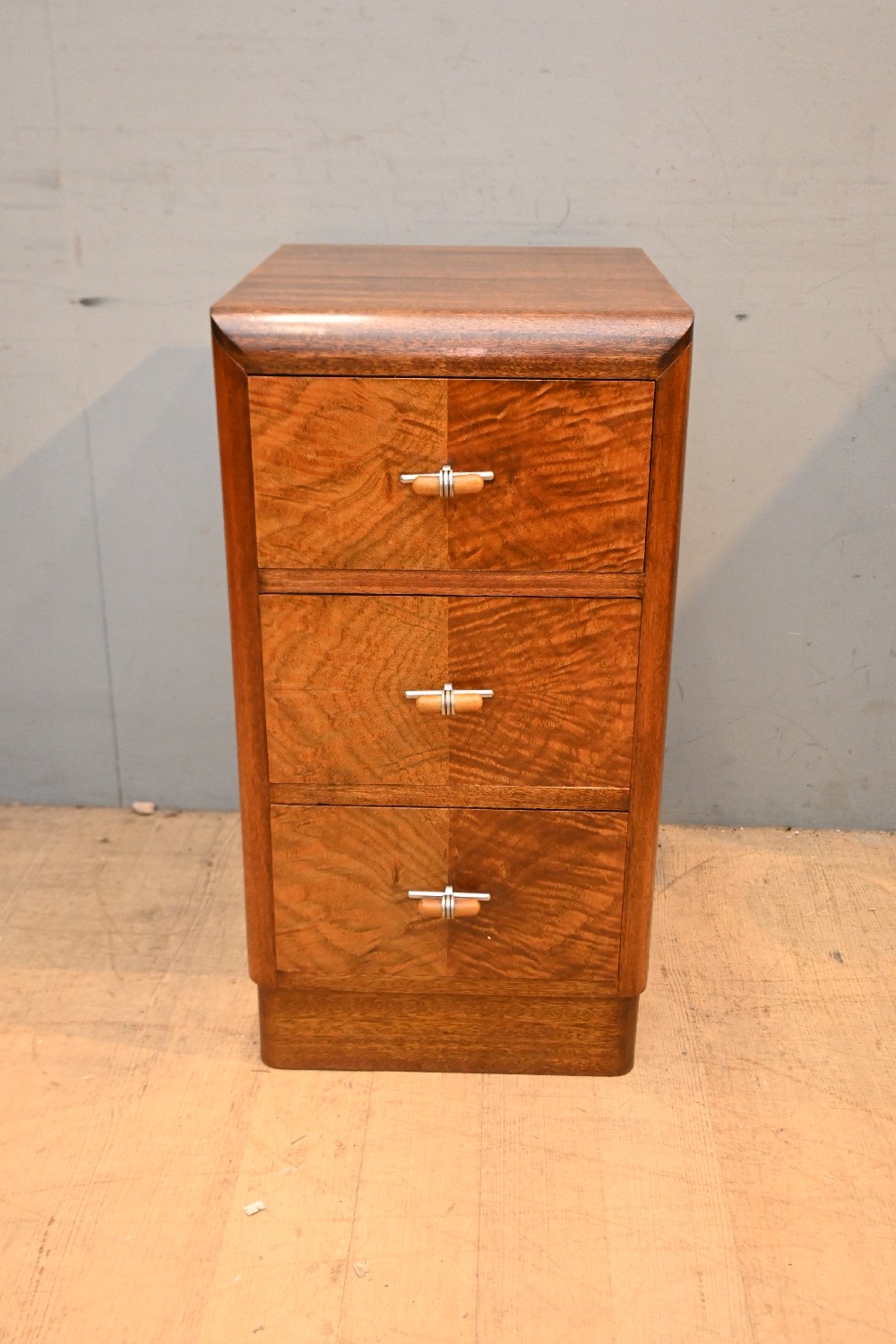 AN ART DECO BIRCH THREE DRAWER BEDSIDE (72H X 39W X 45D CM) (LEONARD JOEL DELIVERY SIZE: LARGE)