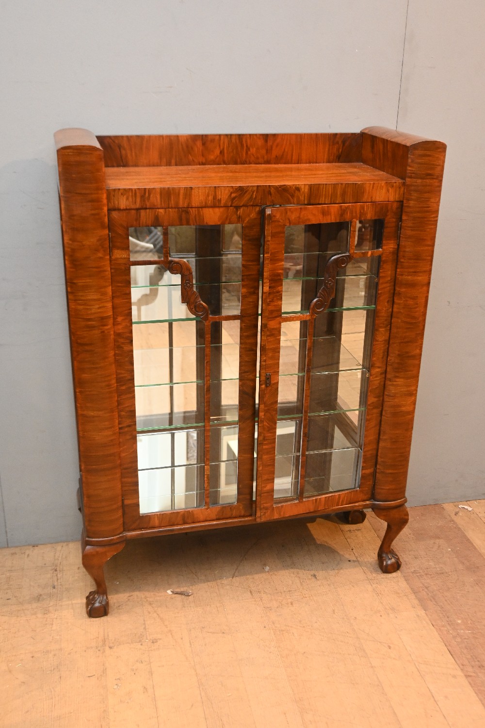 AN ENGLISH ART DECO WALNUT DISPLAY CABINET WITH TWO SHELVES (A/F) (123H X 88W X 30D CM) (LEONARD JOEL DELIVERY SIZE: X-LARGE)