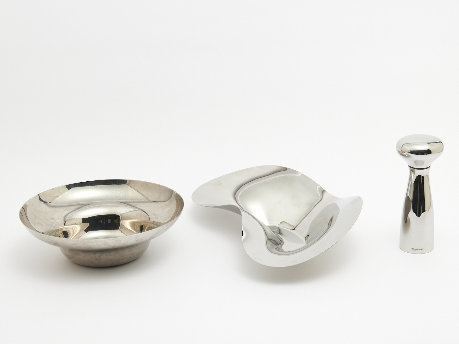 A PAIR OF GEORG JENSEN BOWLS WITH A JENSEN PEPPER MILL L.40CM, LEONARD JOEL DELIVERY SIZE: SMALL