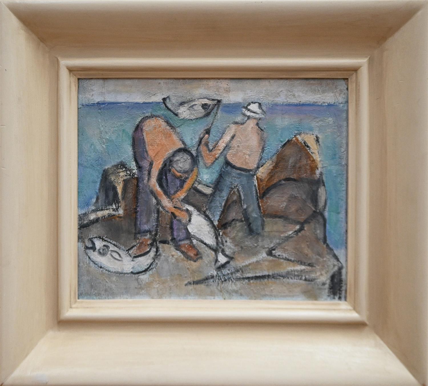 ARTIST UNKNOWN, FIGURES FISHING, OIL ON MASONITE, UNSIGNED, 19 X 25CM, FRAME SIZE: 32.5 X 38CM