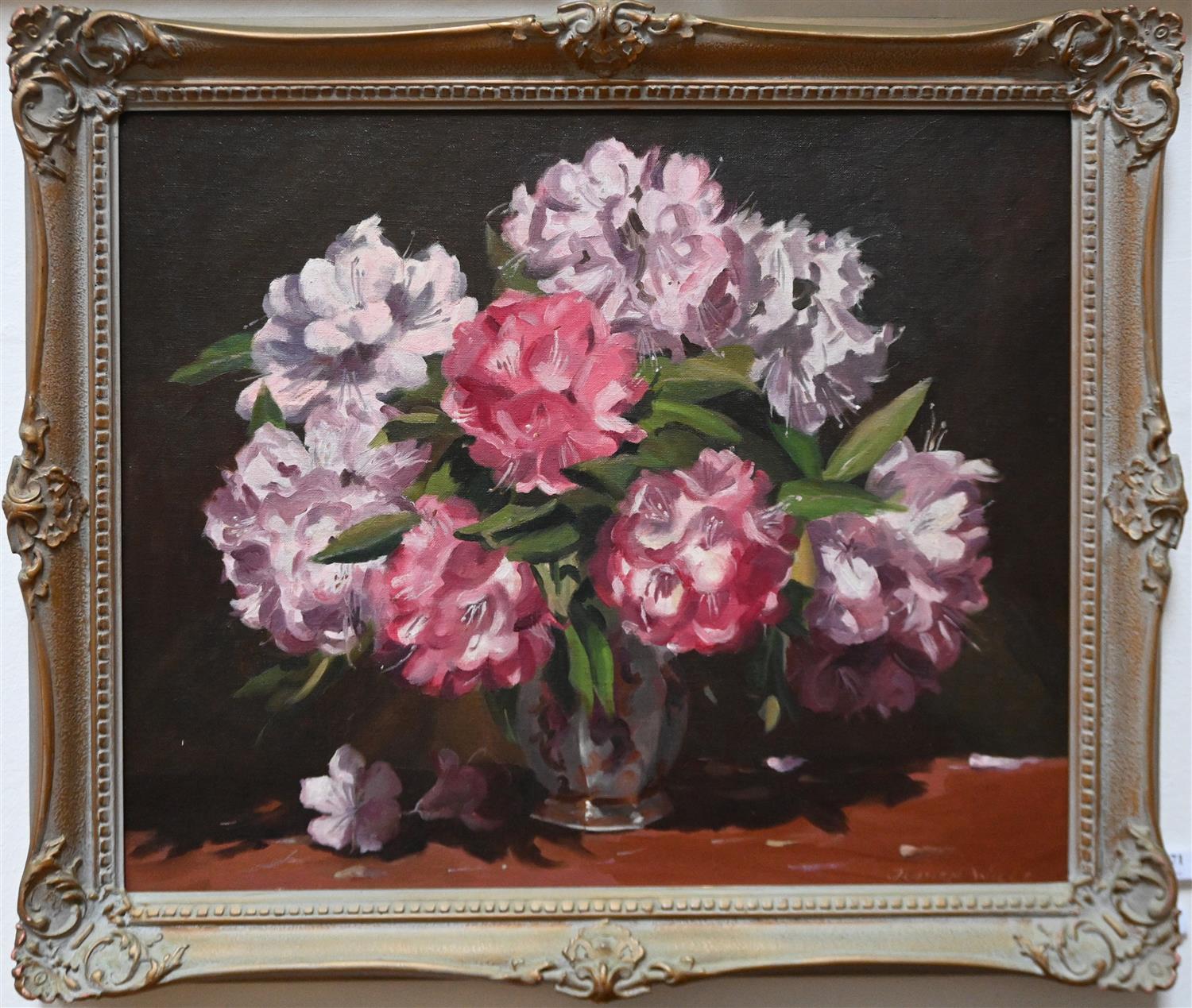 JUDITH WILLS, RHODODENDRONS, OIL ON CANVASBOARD, SIGNED LOWER RIGHT, 48.5 X 58.5CM, FRAME SIZE: 60 X 70CM