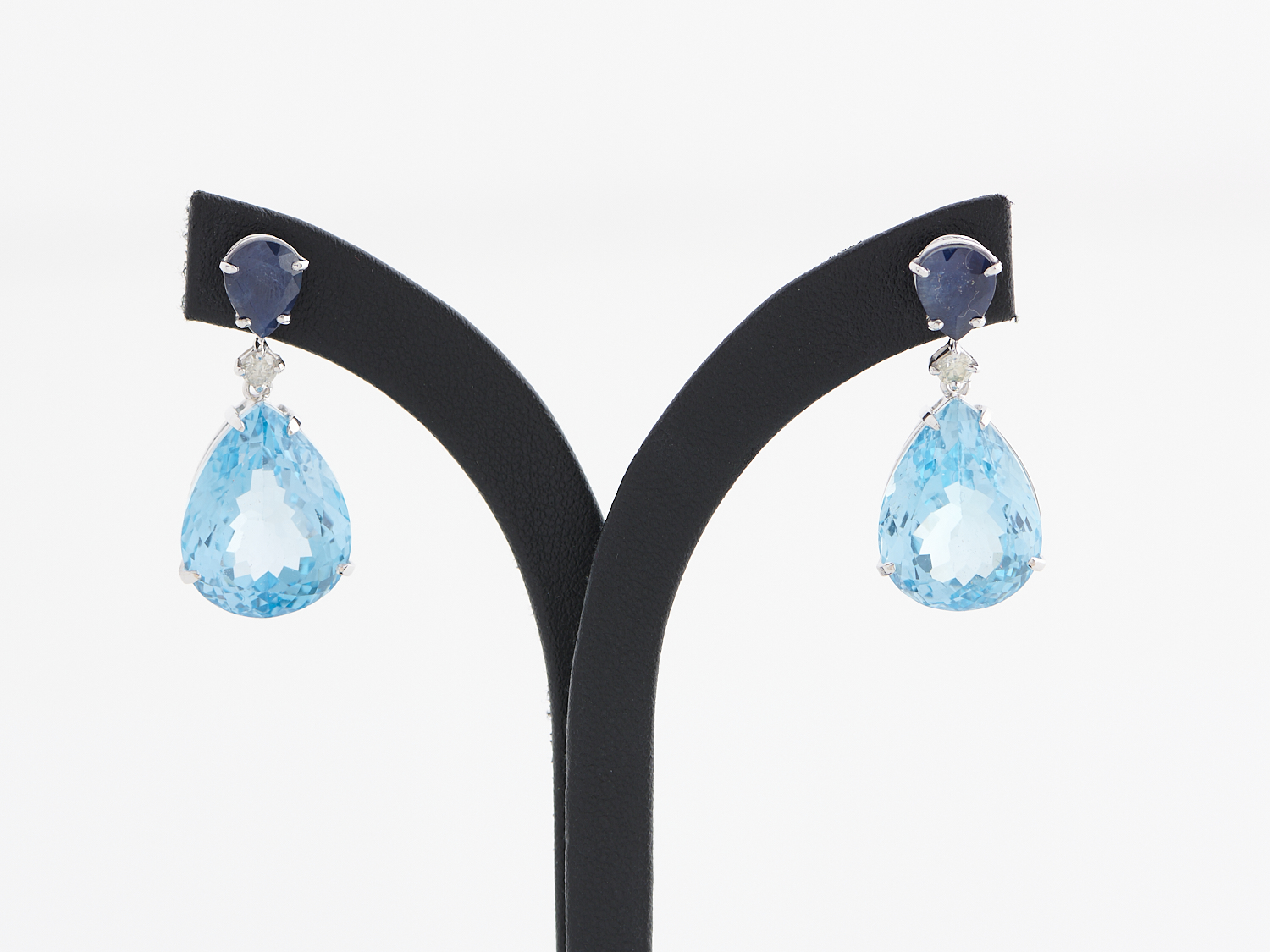 A PAIR OF TOPAZ, SAPPHIRE AND DIAMOND EARRINGS IN 18CT WHITE GOLD, THE TOPAZ WEIGHING 53.06CTS, THE SAPPHIRE TOTALLING 4.08CTS, WITH DIAMONDS TOTALLING 0.34CTS, TO POST AND BUTTERFLY FITTINGS, LENGTH 36MM
