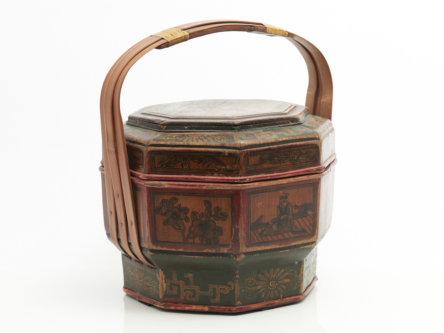 AN ANTIQUE CHINESE PAINTED PINE TRAVELLING FOOD CONTAINER H.32CM, LEONARD JOEL DELIVERY SIZE: SMALL