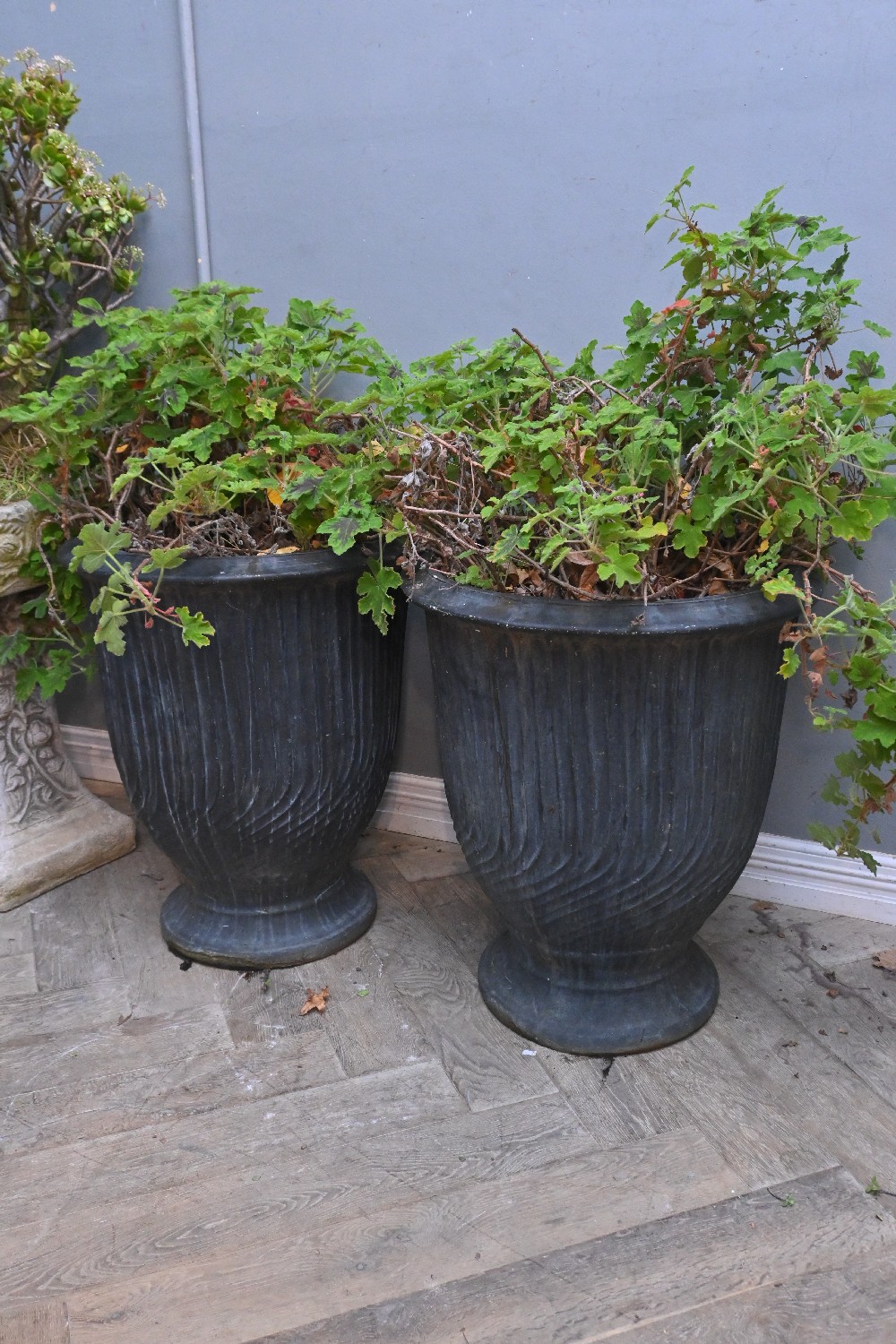 A PAIR OF LARGE CLASSICAL-STYLE COMPOSITE STONE PLANT POTS, PAINTED DARK GREEN, BOTH POTTED WITH GERANIUMS (A/F) (133H X 64D CM) (PLEASE NOTE THIS HEAVY ITEM MUST BE REMOVED BY CARRIERS AT THE CUSTOMER'S EXPENSE. LEONARD JOEL STAFF CANNOT ASSIST CARRYING THIS ITEM) (LARGE ITEM)