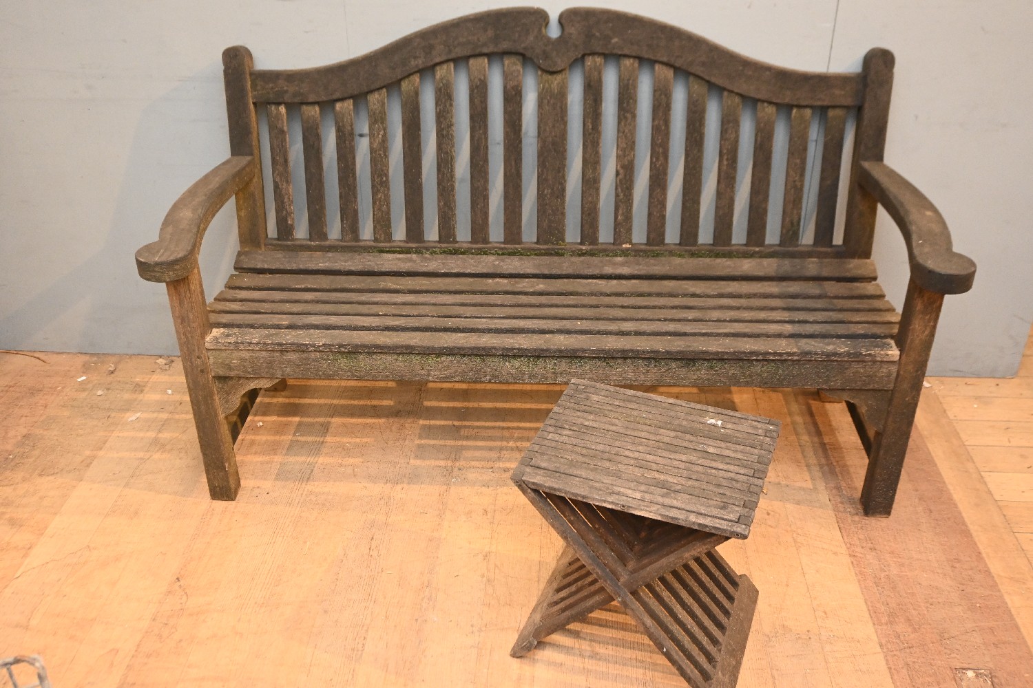 A HARDWOOD GARDEN BENCH SEAT, AND A SMALL HARDWOOD GARDEN TABLE (BOTH WEATHERED) (A/F) (95H X 160W X 65D CM) (PLEASE NOTE THIS HEAVY ITEM MUST BE REMOVED BY CARRIERS AT THE CUSTOMER'S EXPENSE. LEONARD JOEL STAFF CANNOT ASSIST CARRYING THIS ITEM) (LARGE ITEM)