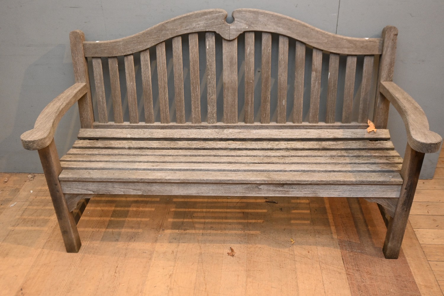 A HARDWOOD GARDEN BENCH SEAT - WEATHERED (A/F) (97H X 158W X 69D CM) (PLEASE NOTE THIS HEAVY ITEM MUST BE REMOVED BY CARRIERS AT THE CUSTOMER'S EXPENSE. LEONARD JOEL STAFF CANNOT ASSIST CARRYING THIS ITEM) (LARGE ITEM)
