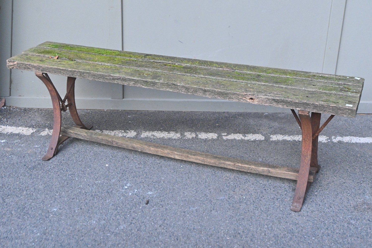 A HARDWOOD AND WROUGHT IRON GARDEN BENCH - WEATHERED (A/F) (46H X 153W X 33D CM) (PLEASE NOTE THIS HEAVY ITEM MUST BE REMOVED BY CARRIERS AT THE CUSTOMER'S EXPENSE. LEONARD JOEL STAFF CANNOT ASSIST CARRYING THIS ITEM) (LARGE ITEM)