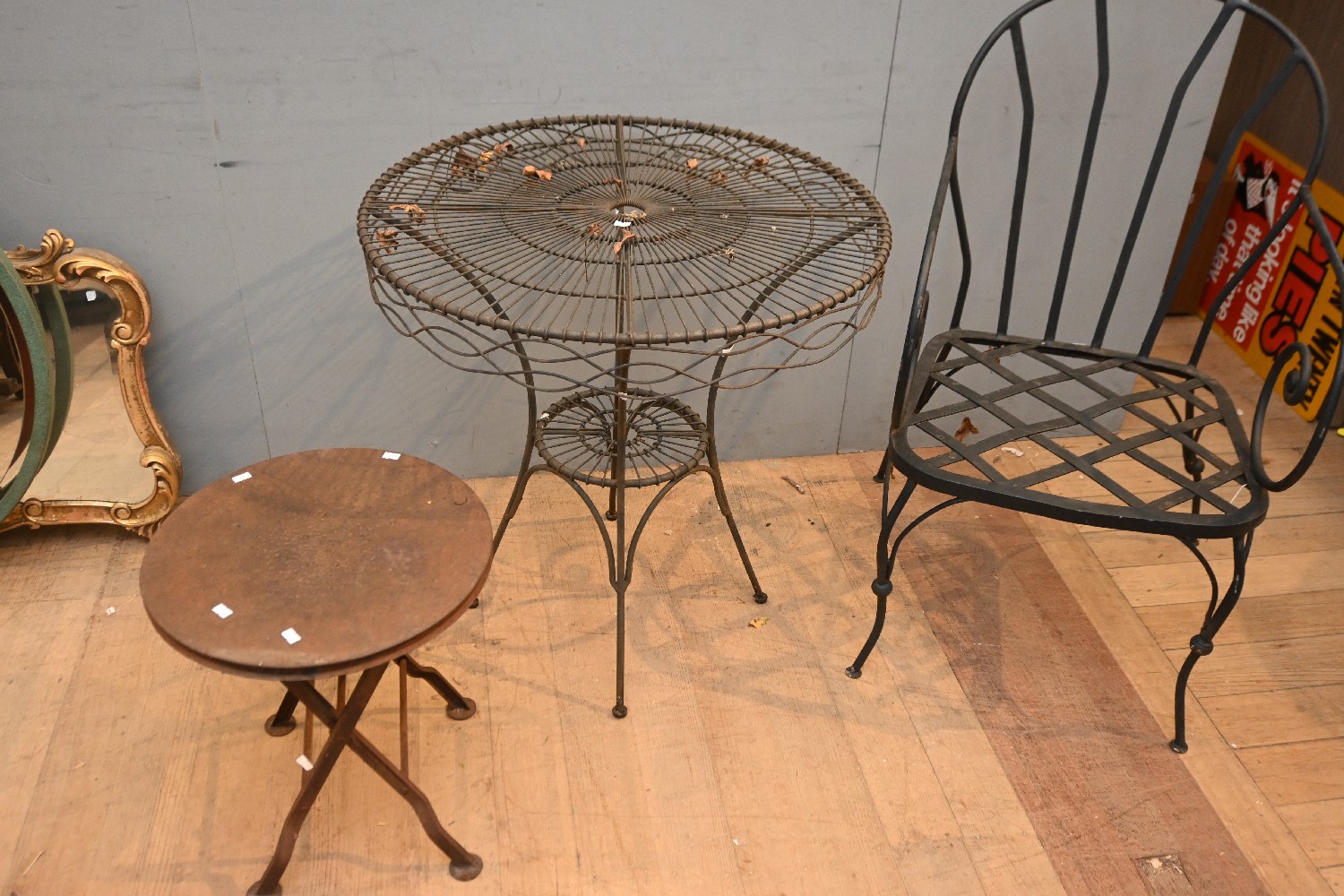A GROUP METAL GARDEN FURNITURE, COMPRISING A WROUGHT IRON ELBOW CHAIR, A WROUGHT IRON AND WIREWORK TABLE, AND A SMALLER TABLE (A/F) (CHAIR 97H X 54W X 59D CM) (LEONARD JOEL DELIVERY SIZE: LARGE)