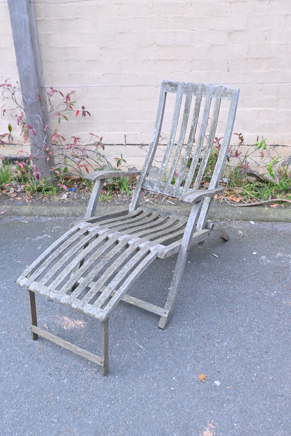 A HARDWOOD GARDEN LOUNGE CHAIR - WEATHERED (A/F) (89H X 60W X 130D CM) (LEONARD JOEL DELIVERY SIZE: X-LARGE)