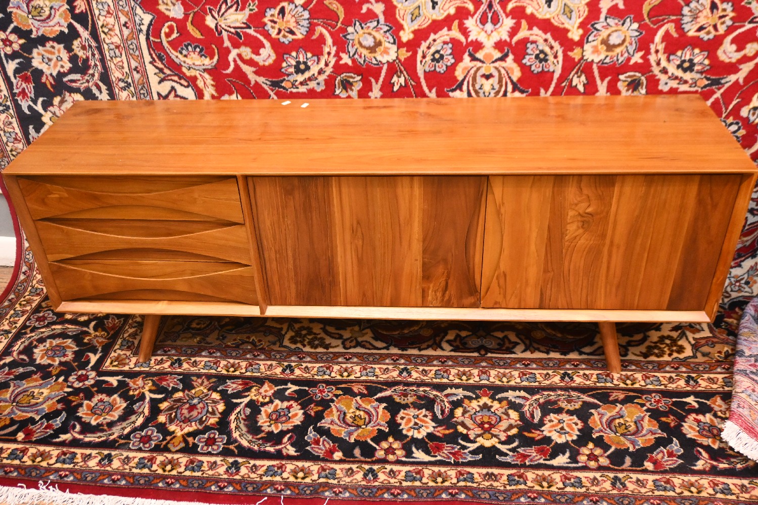 A SOLID TEAK LOW RISE SIDEBOARD (61H X 160W X 40D CM) (PLEASE NOTE THIS HEAVY ITEM MUST BE REMOVED BY CARRIERS AT THE CUSTOMER'S EXPENSE. LEONARD JOEL STAFF CANNOT ASSIST CARRYING THIS ITEM) (LARGE ITEM)