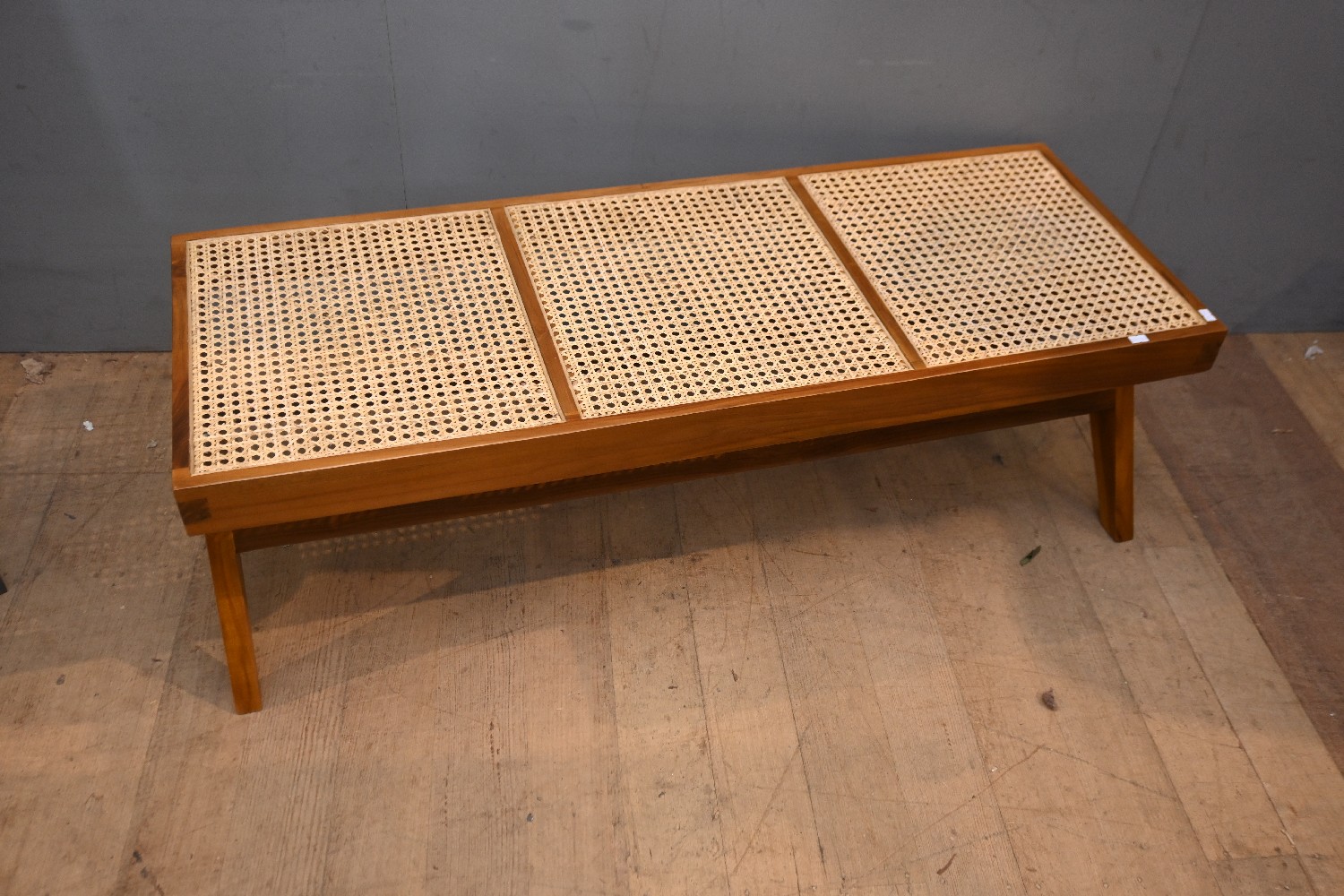 A TEAK AND RATTAN BENCH SEAT (38H X 120W X 46D CM) (LEONARD JOEL DELIVERY SIZE: LARGE)