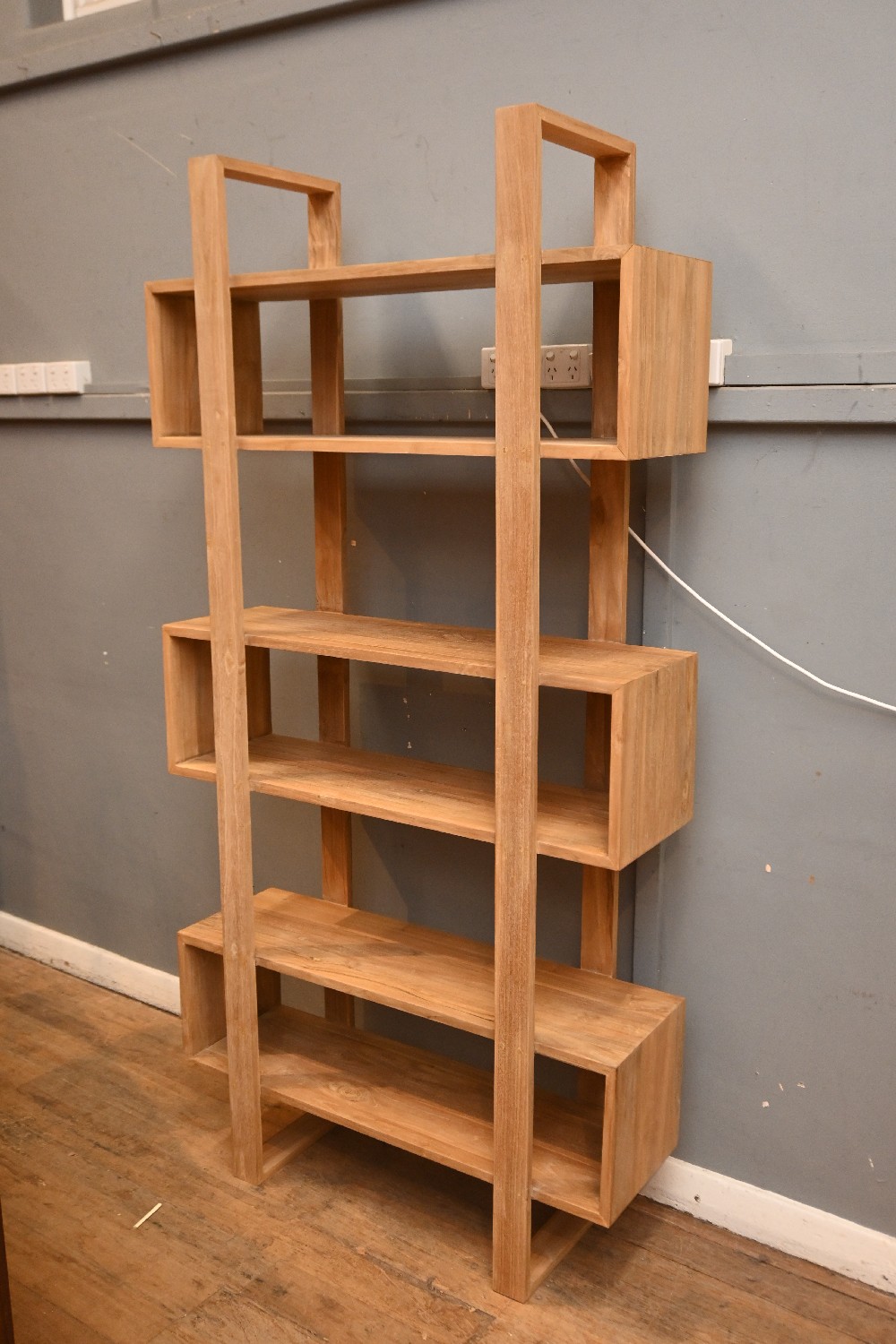 A SOLID TEAK MODERN BOOKCASE (200H X 100W X 34D CM) (PLEASE NOTE THIS HEAVY ITEM MUST BE REMOVED BY CARRIERS AT THE CUSTOMER'S EXPENSE. LEONARD JOEL STAFF CANNOT ASSIST CARRYING THIS ITEM) (LARGE ITEM)