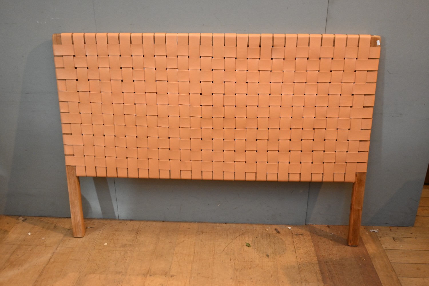 A TEAK AND LEATHER STRAPPED QUEEN BED HEAD (112H X 157W CM) (LEONARD JOEL DELIVERY SIZE: X-LARGE)