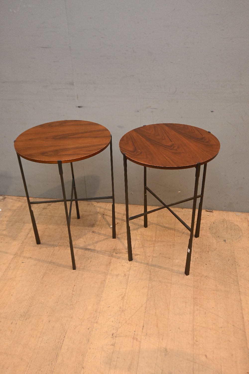 A PAIR OF CONTEMPORARY WALNUT AND WROUGHT IRON CIRCULAR OCCASIONAL TABLES, BY BAKER FURNITURE (64H X 45D CM) (LEONARD JOEL DELIVERY SIZE: LARGE)