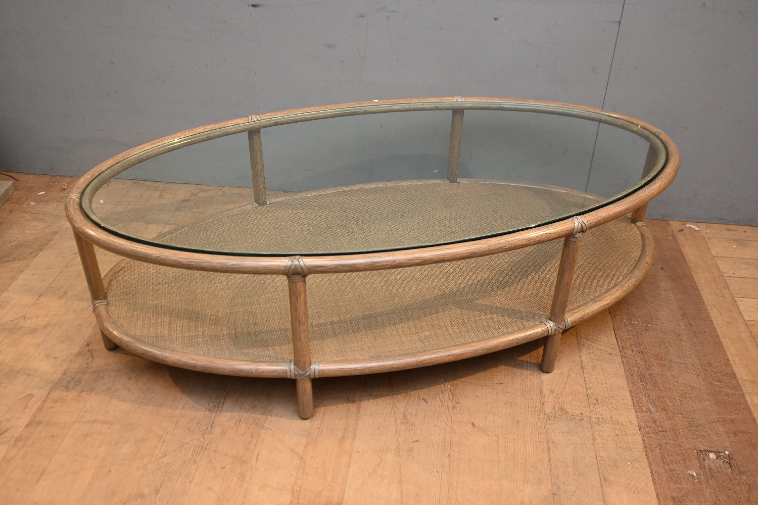 A GLASS-TOPPED LIMED HARDWOOD OVAL LOW TABLE (45H X 154W X 81D CM) (PLEASE NOTE THIS HEAVY ITEM MUST BE REMOVED BY CARRIERS AT THE CUSTOMER'S EXPENSE. LEONARD JOEL STAFF CANNOT ASSIST CARRYING THIS ITEM) (LARGE ITEM)