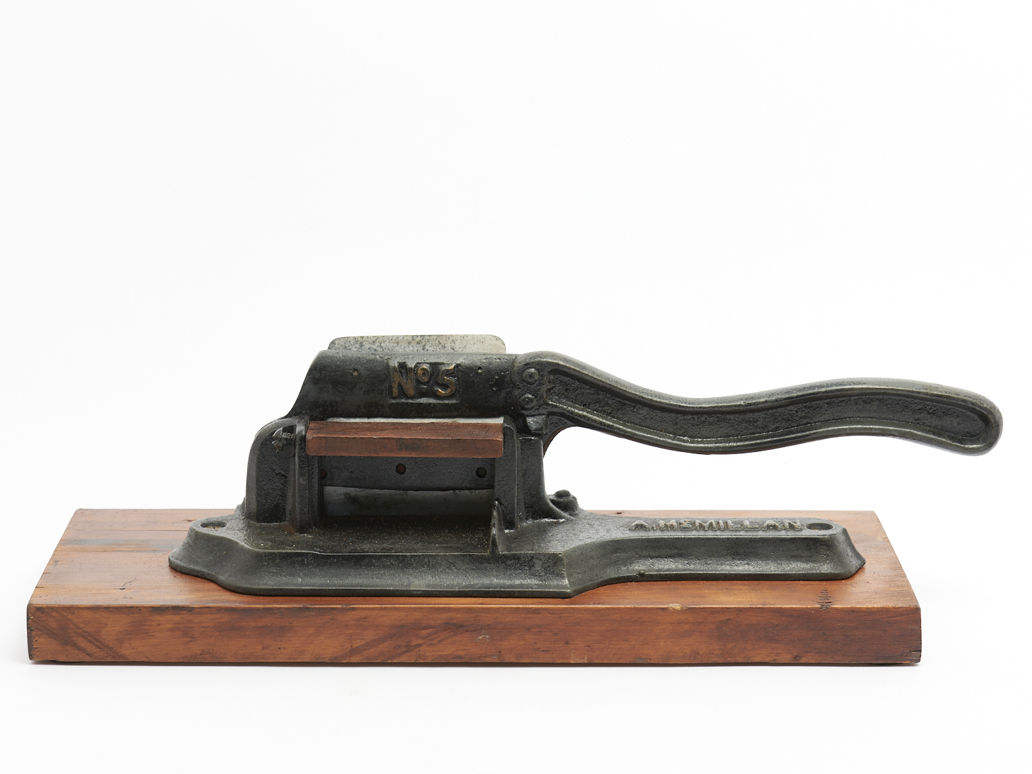 AN ANTIQUE CAST-IRON WOODEN MOUNTED NUMBER 5 TOBACCO CUTTER L.31CM, LEONARD JOEL LOCAL DELIVERY: SMALL