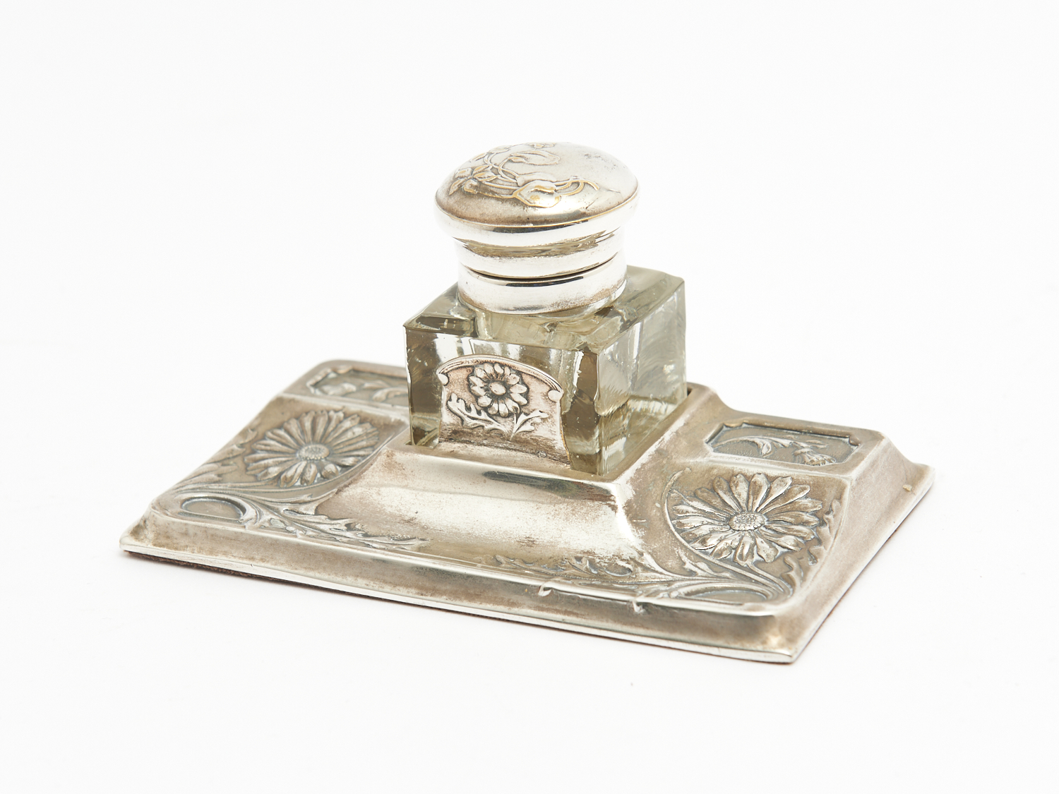 A FRENCH ART NOUVEAU SILVER FLORAL DECORATED INKWELL L.13CM, LEONARD JOEL LOCAL DELIVERY: SMALL