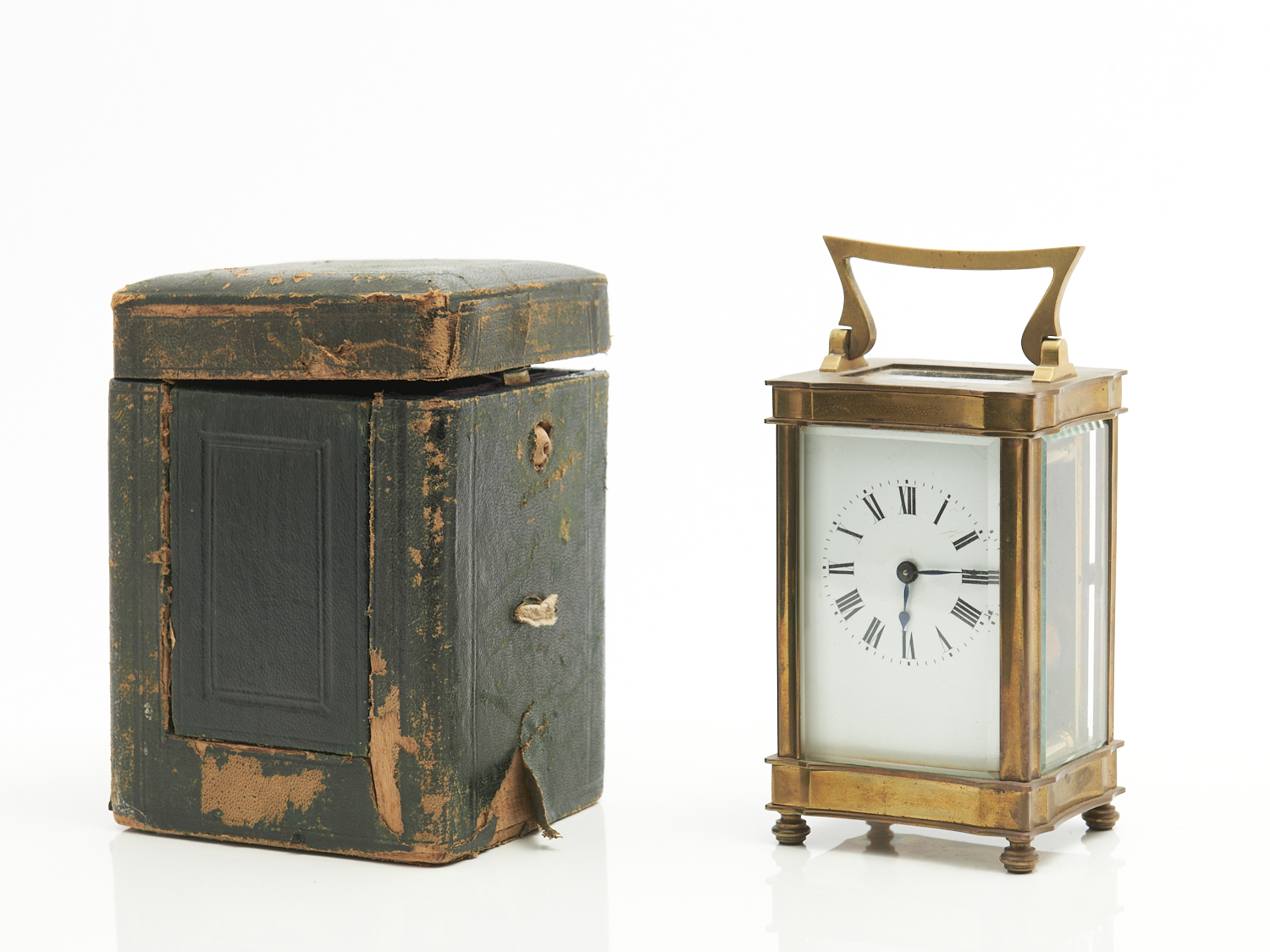 A 19TH CENTURY FRENCH CARRIAGE CLOCK WITH LEATHER CASE WITH ORIGINAL KEY H.13CM, LEONARD JOEL LOCAL DELIVERY: SMALL