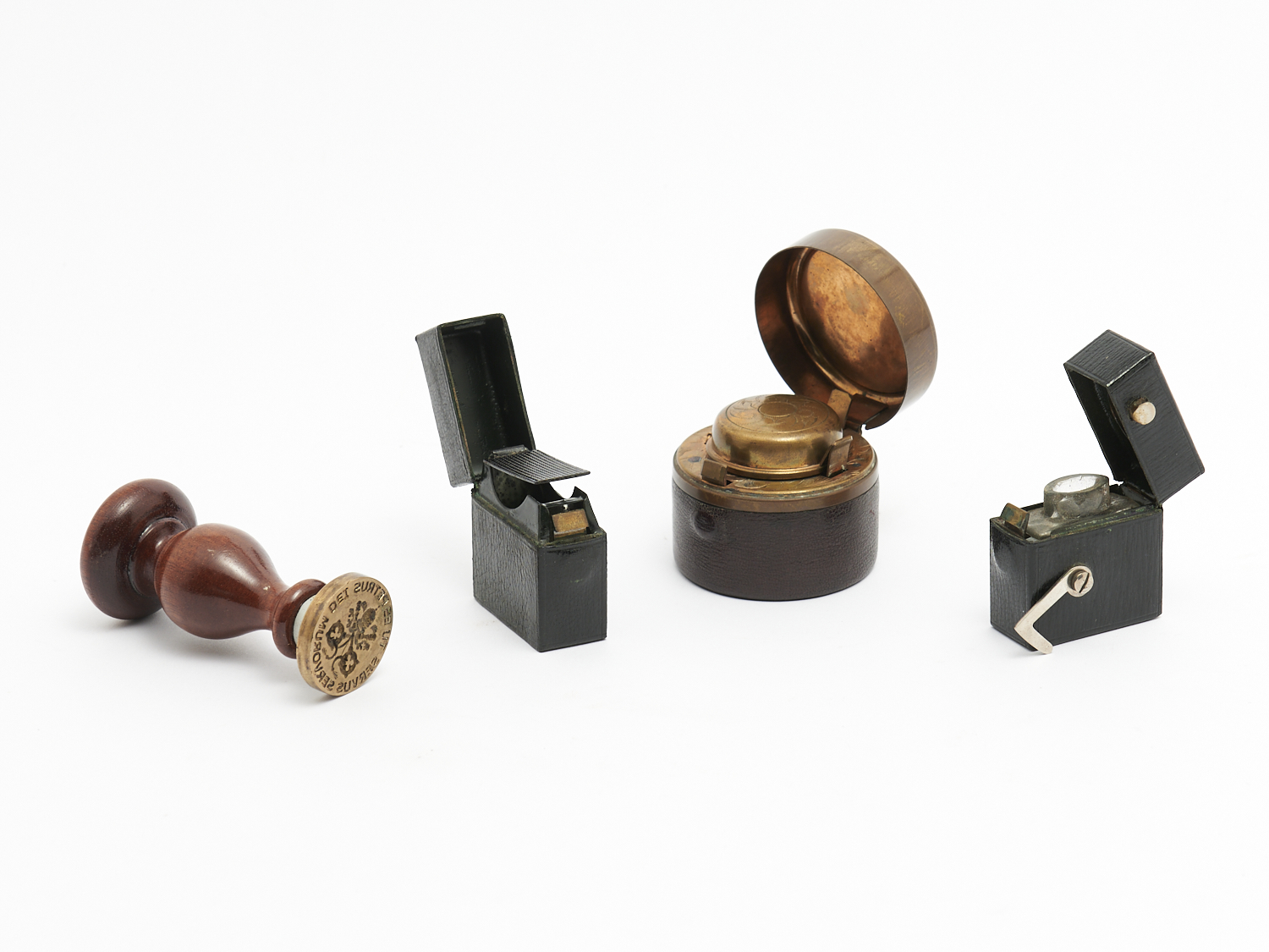 A GROUP OF THREE 19TH CENTURY LEATHER AND BRASS TRAVELLING INKWELLS AND WOODEN AND BRASS FRENCH LETTER SEAL H.9CM (TALLEST), LEONARD JOEL DELIVERY SIZE: SMALL