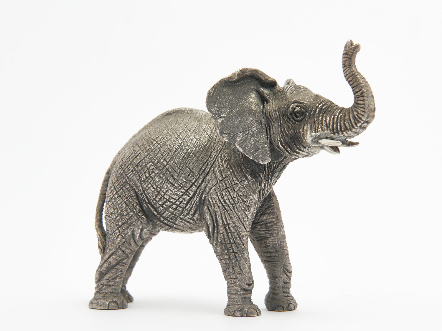 A STERLING SILVER MOUNTED NATURALISTIC ELEPHANT WITH RAISED TUSK H.11CM, LEONARD JOEL LOCAL DELIVERY: SMALL