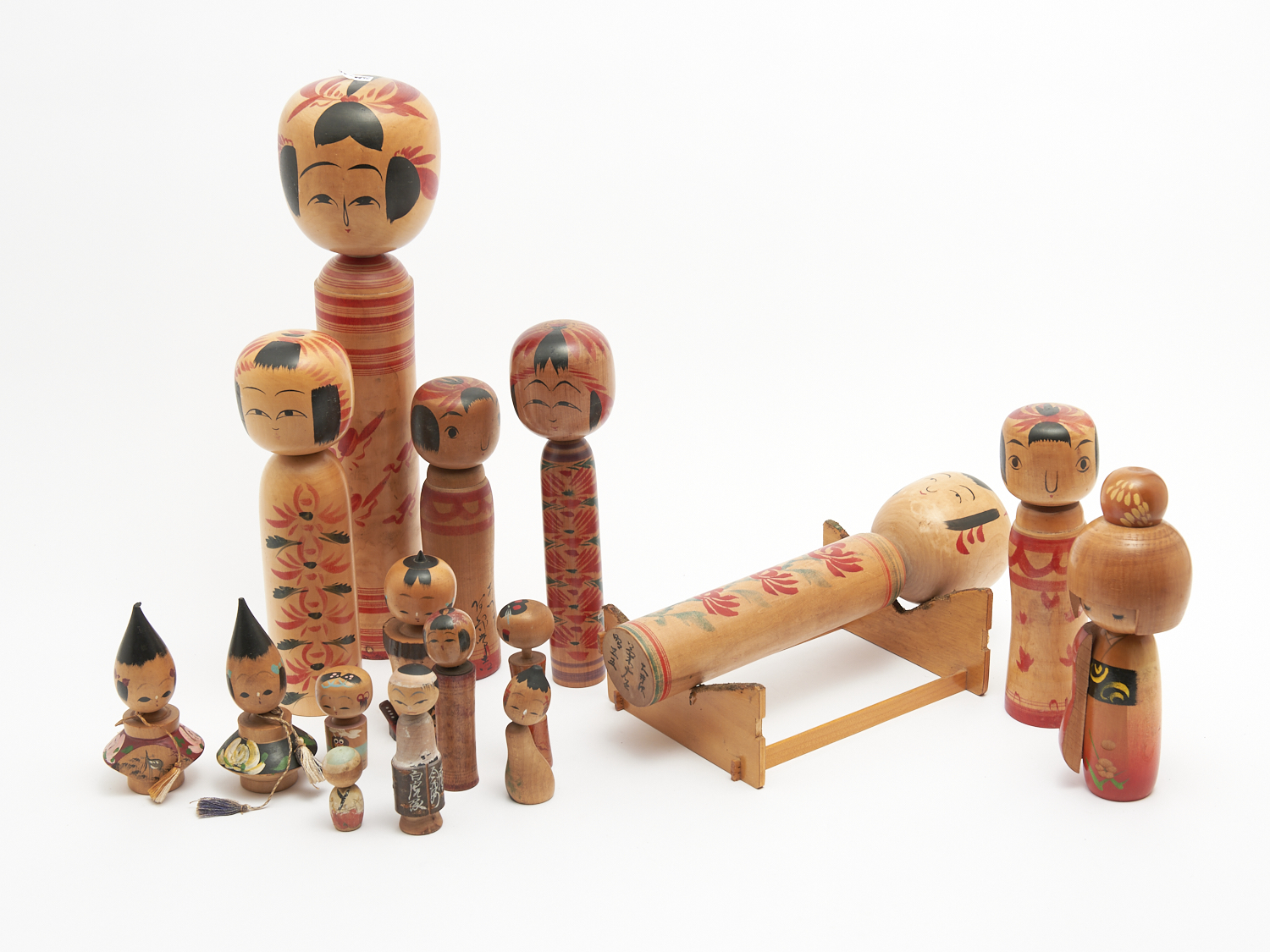 SIXTEEN HAND-PAINTED CARVED KOKESHI DOLLS (SOME WITH BARK DETAILS) H.39CM, LEONARD JOEL LOCAL DELIVERY: MEDIUM