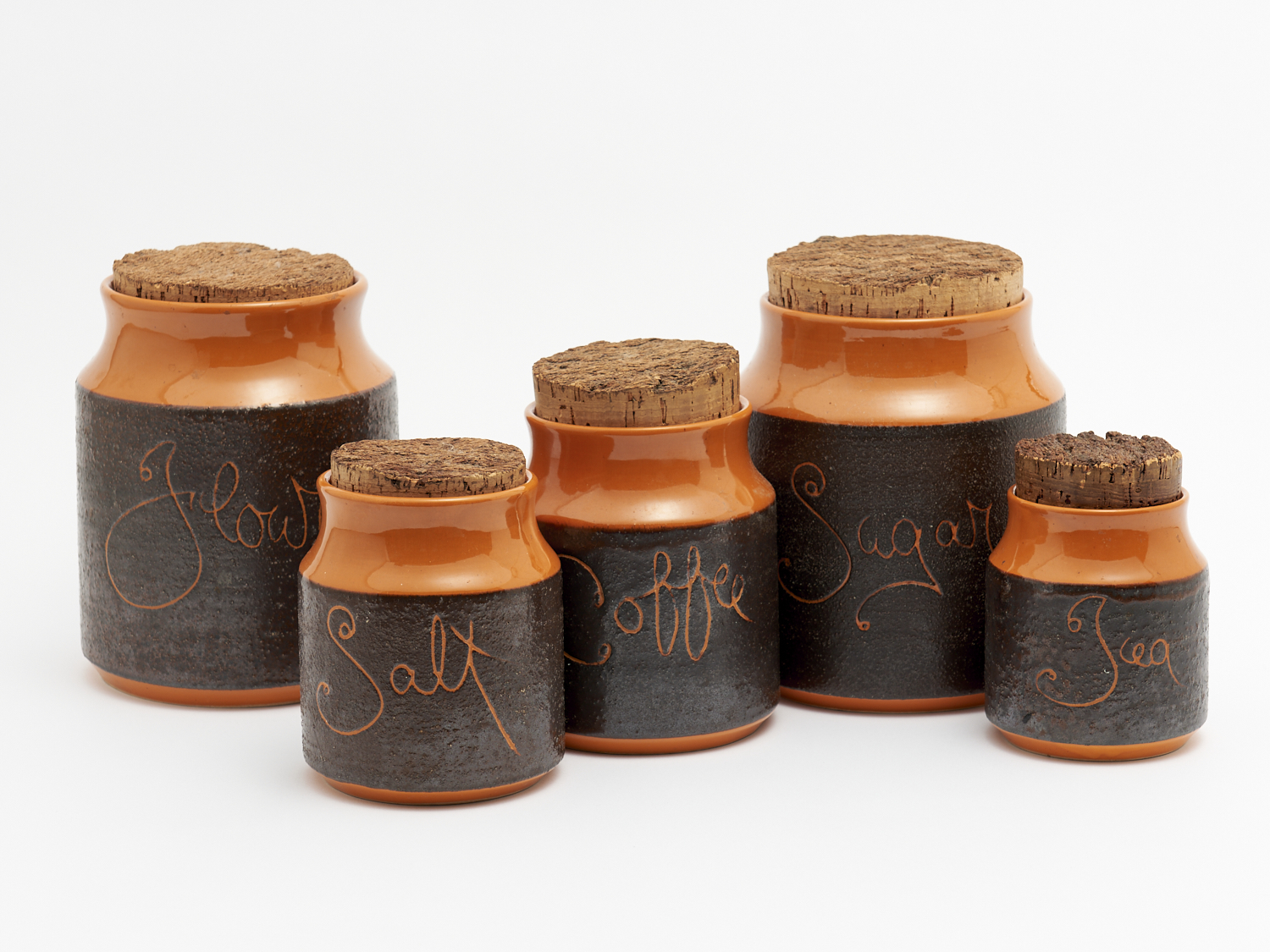 A GRADUATED SET OF FIVE AUSTRALIAN SIGNED POTTERY KITCHEN CANISTERS H.20CM (LARGEST), LEONARD JOEL LOCAL DELIVERY: MEDIUM