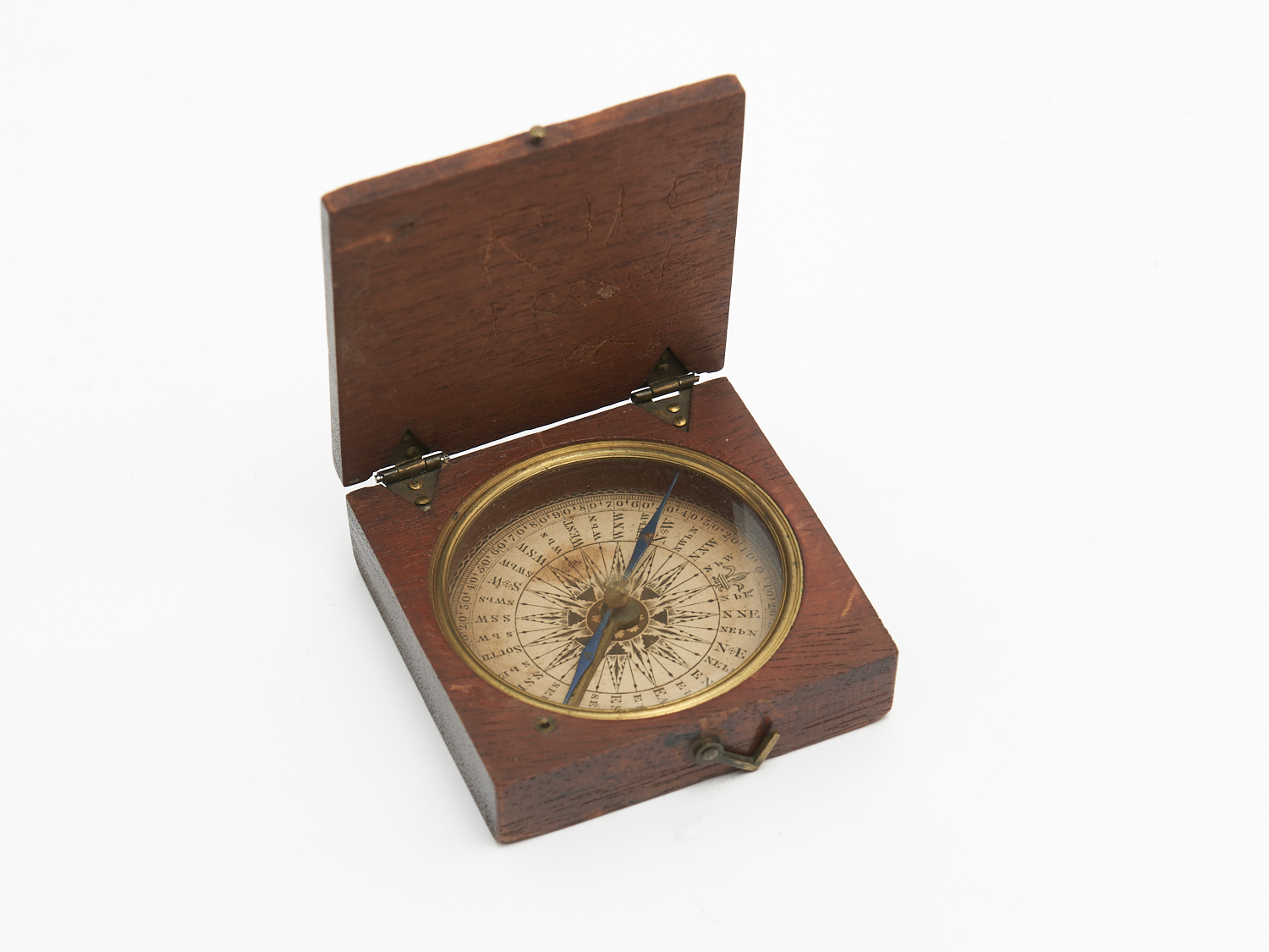 AN EARLY 19TH CENTURY AUSTRALIAN CEDAR MOUNTED TRAVELLING BRASS COMPASS 6.5 X 6.5CM, LEONARD JOEL LOCAL DELIVERY: SMALL
