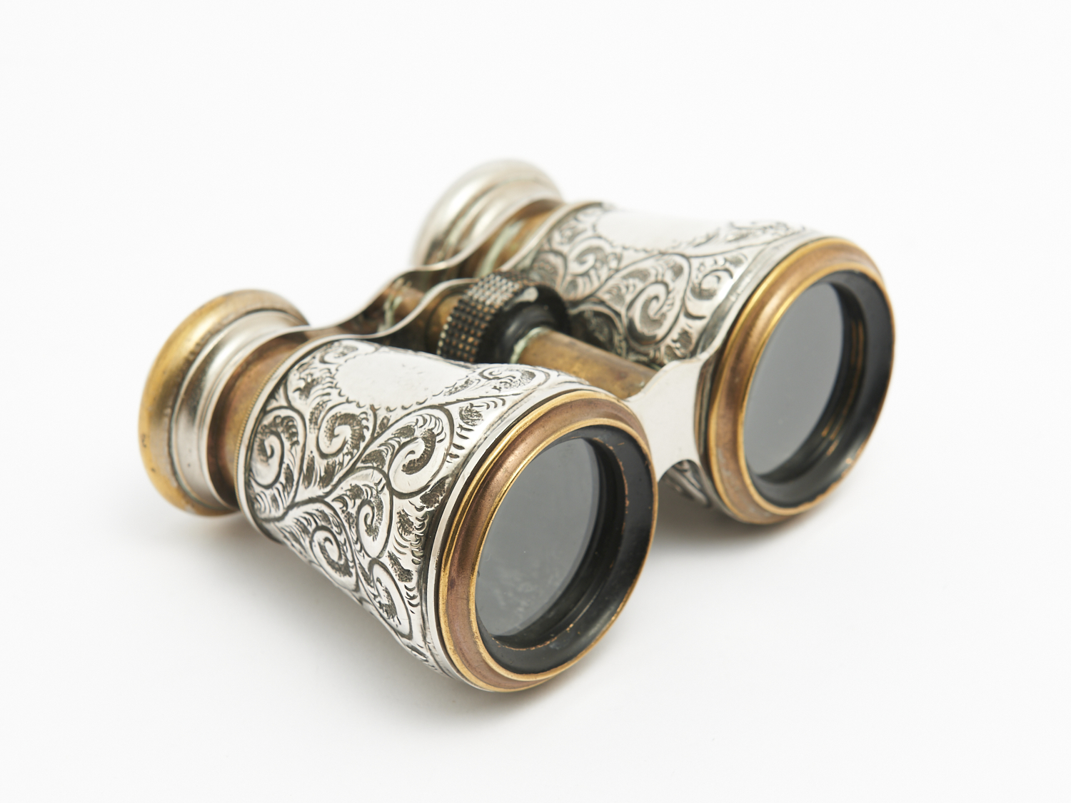 A PAIR OF 19TH CENTURY ENGLISH BRASS AND STERLING SILVER COVERED BINOCULARS W.12CM, LEONARD JOEL LOCAL DELIVERY: SMALL