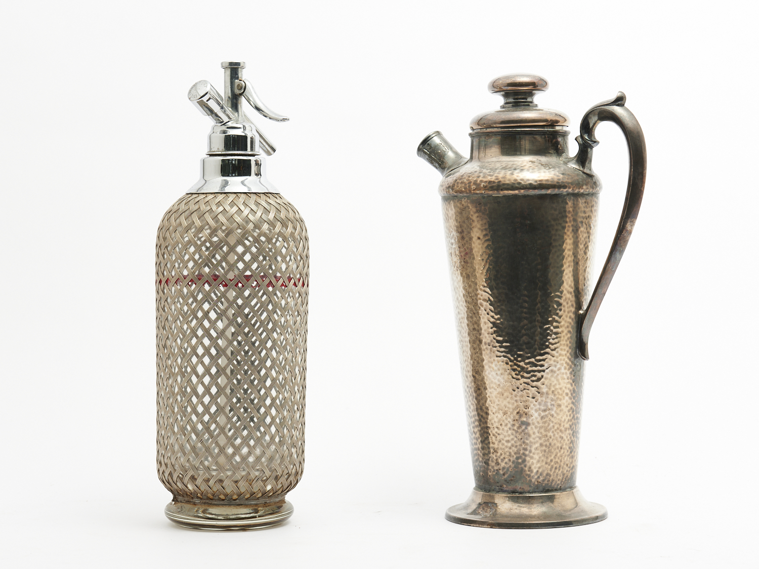 A LARGE COCKTAIL SHAKER WITH A SODA SYPHON H.33CM, LEONARD JOEL DELIVERY SIZE: SMALL
