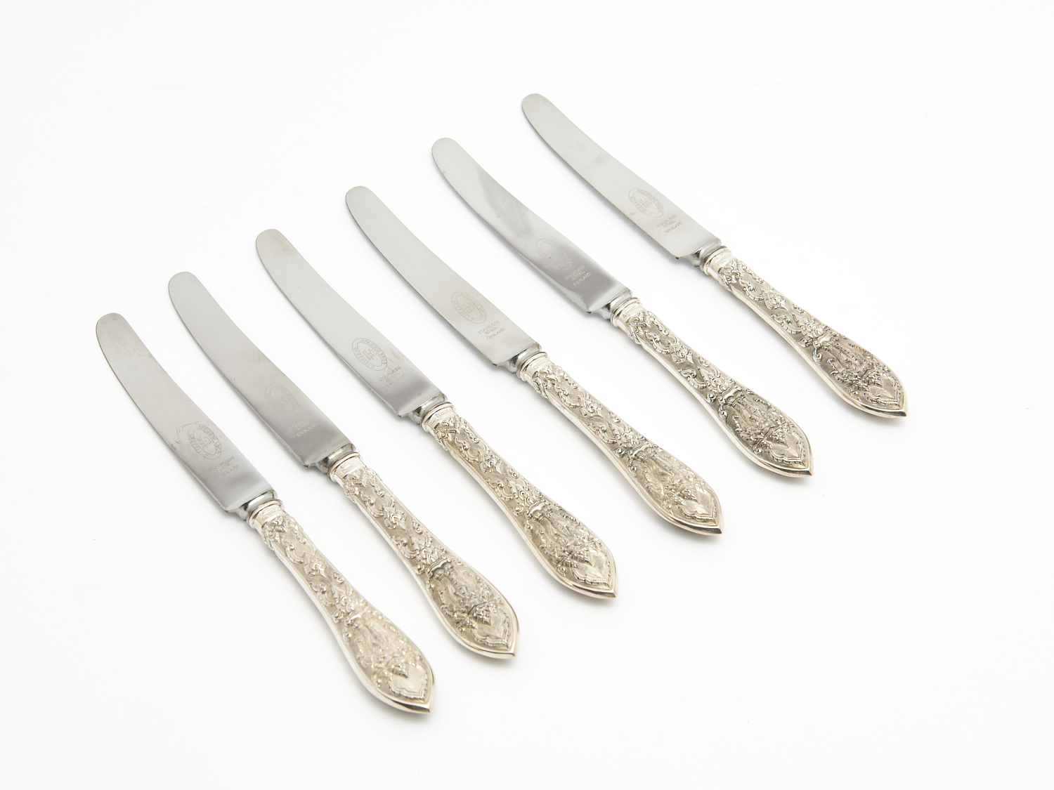 A SET OF SIX THAI STERLING SILVER HANDLED ENTREE KNIVES L.22.5CM, LEONARD JOEL DELIVERY SIZE: SMALL