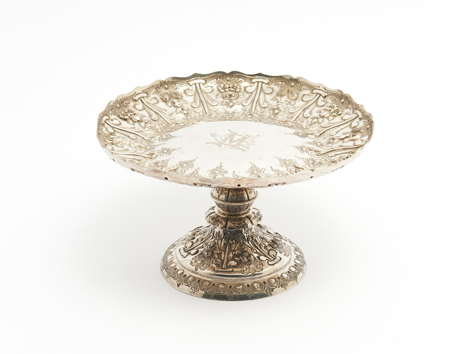 A FINE VICTORIAN STERLING SILVER COMPORT WITH FLORAL DECORATION DIA.19CM 451G, LEONARD JOEL DELIVERY SIZE: SMALL