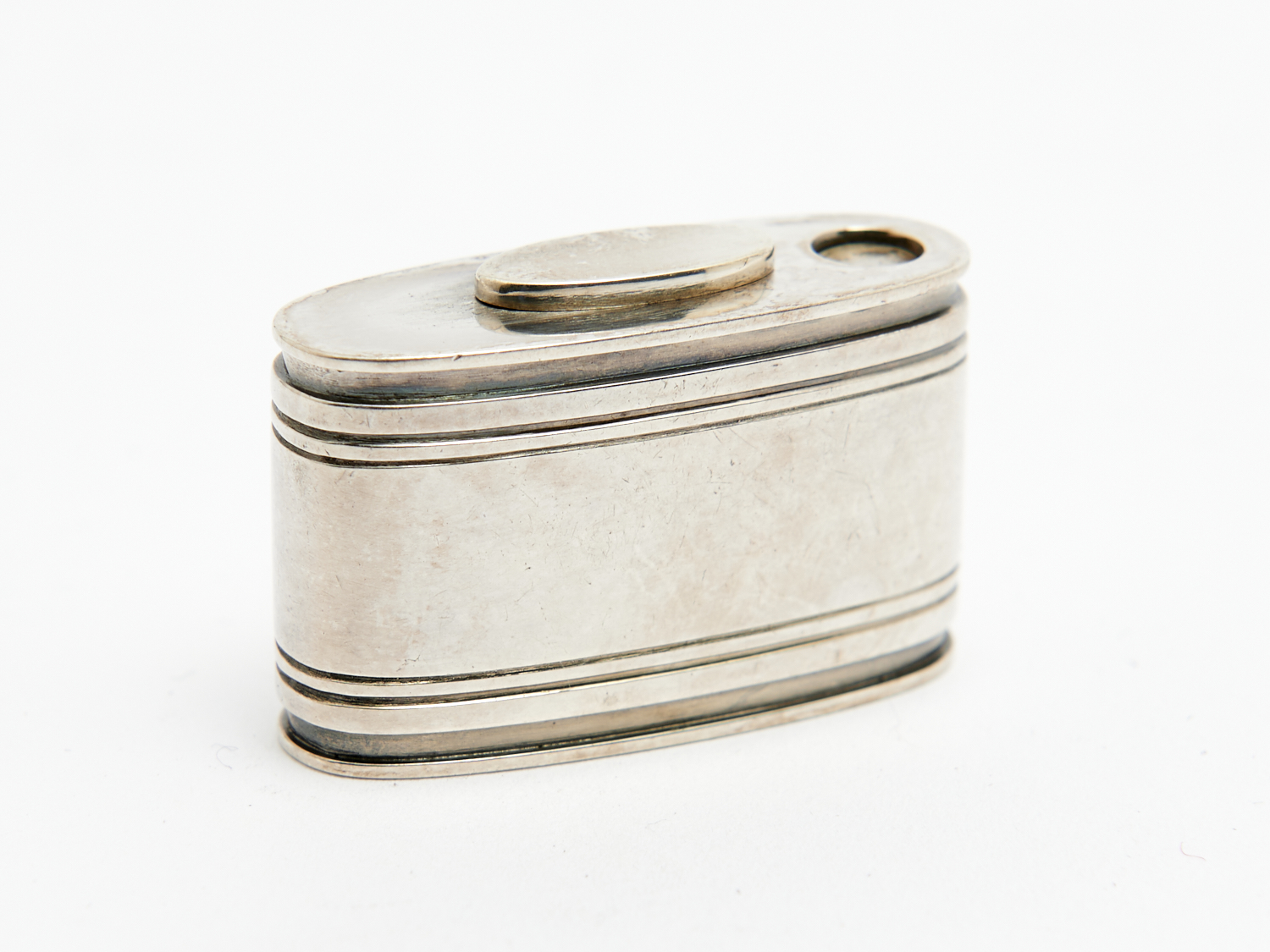 A VINTAGE HALLMARKED GEORGE JENSEN STERLING SILVER PILL BOX L.3.5CM 203G, LEONARD JOEL DELIVERY SIZE: SMALL