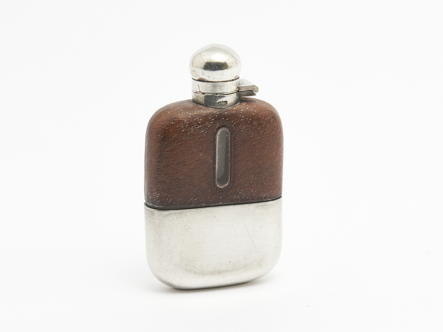 1900S ENGLISH LEATHER AND SILVERPLATED JAMES DIXON & SONS TRAVELLING HIP FLASK WITH REMOVABLE CUP L.10.5CM, LEONARD JOEL DELIVERY SIZE: SMALL