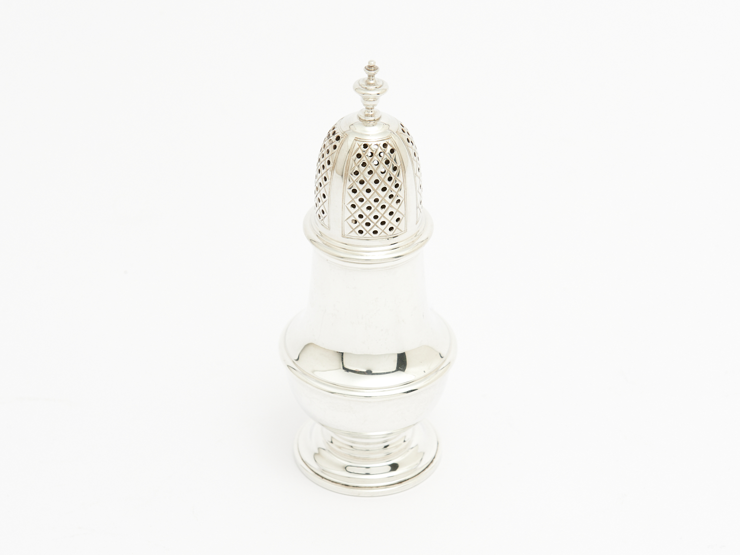 AN ENGLISH HALLMARKED STERLING SILVER CASTOR SUGAR SHAKER H.15.5CM 107G, LEONARD JOEL DELIVERY SIZE: SMALL