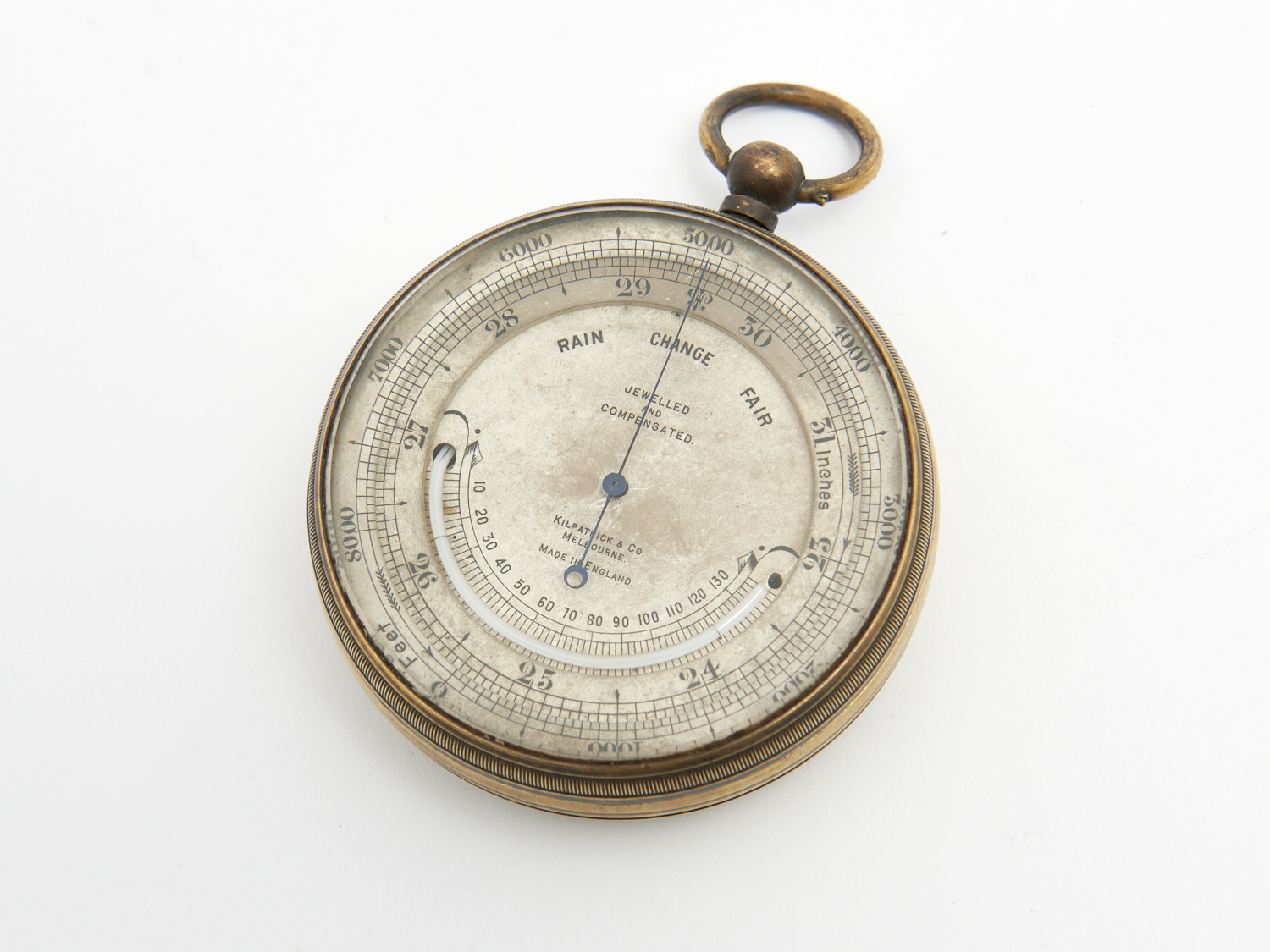 A 19TH CENTURY ENGLISH KILPATRICK & CO. TRAVELLING BRASS CASED THERMOMETER AND BAROMETER DIA.7CM, LEONARD JOEL DELIVERY SIZE: SMALL
