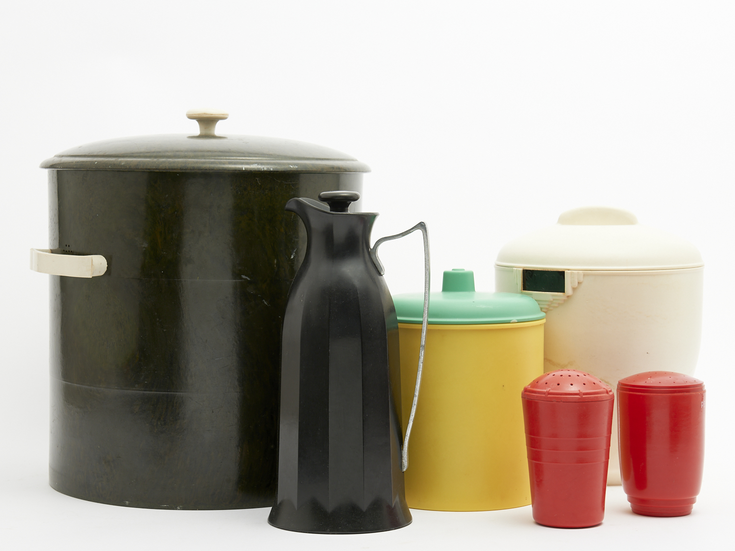 A GROUP OF VINTAGE PLASTIC KITCHEN ITEMS INCL. BAKELITE H.31CM (TALLEST), LEONARD JOEL DELIVERY SIZE: MEDIUM