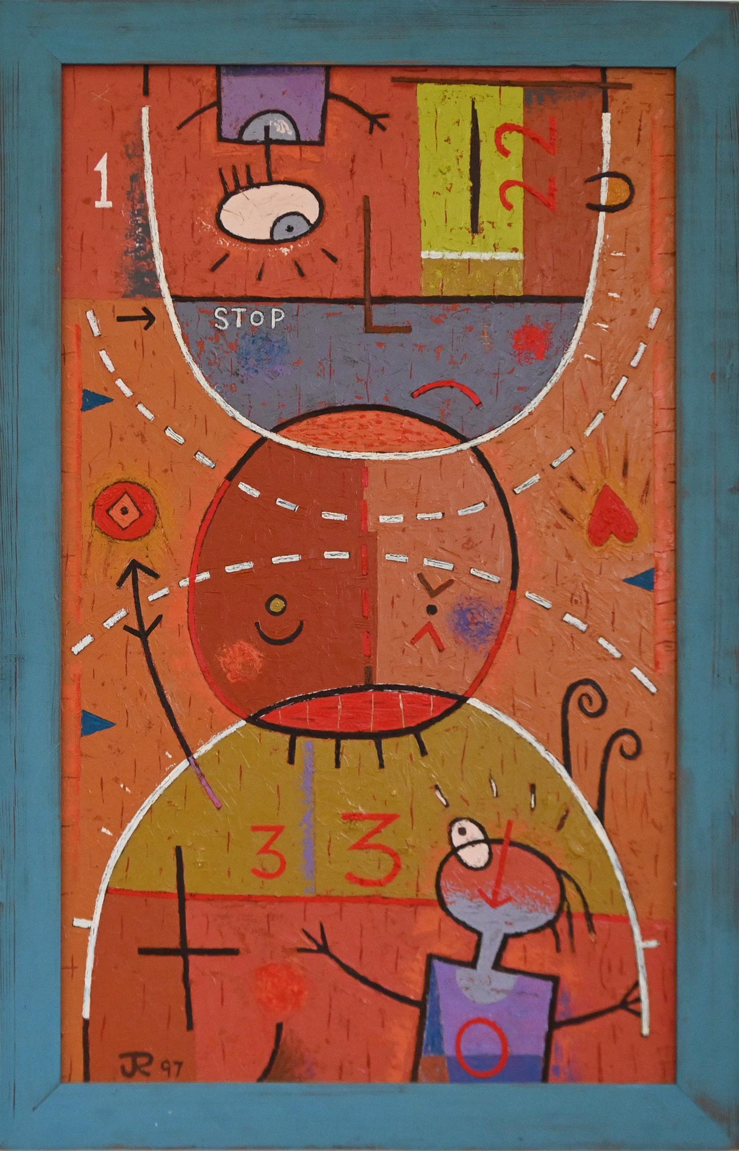 JEFF RAGLUS, GAME OF LIFE 1997, ACRYLIC ON BOARD, SIGNED AND DATED LOWER LEFT, 118 X 71.5CM, FRAME SIZE: 133 X 87CM