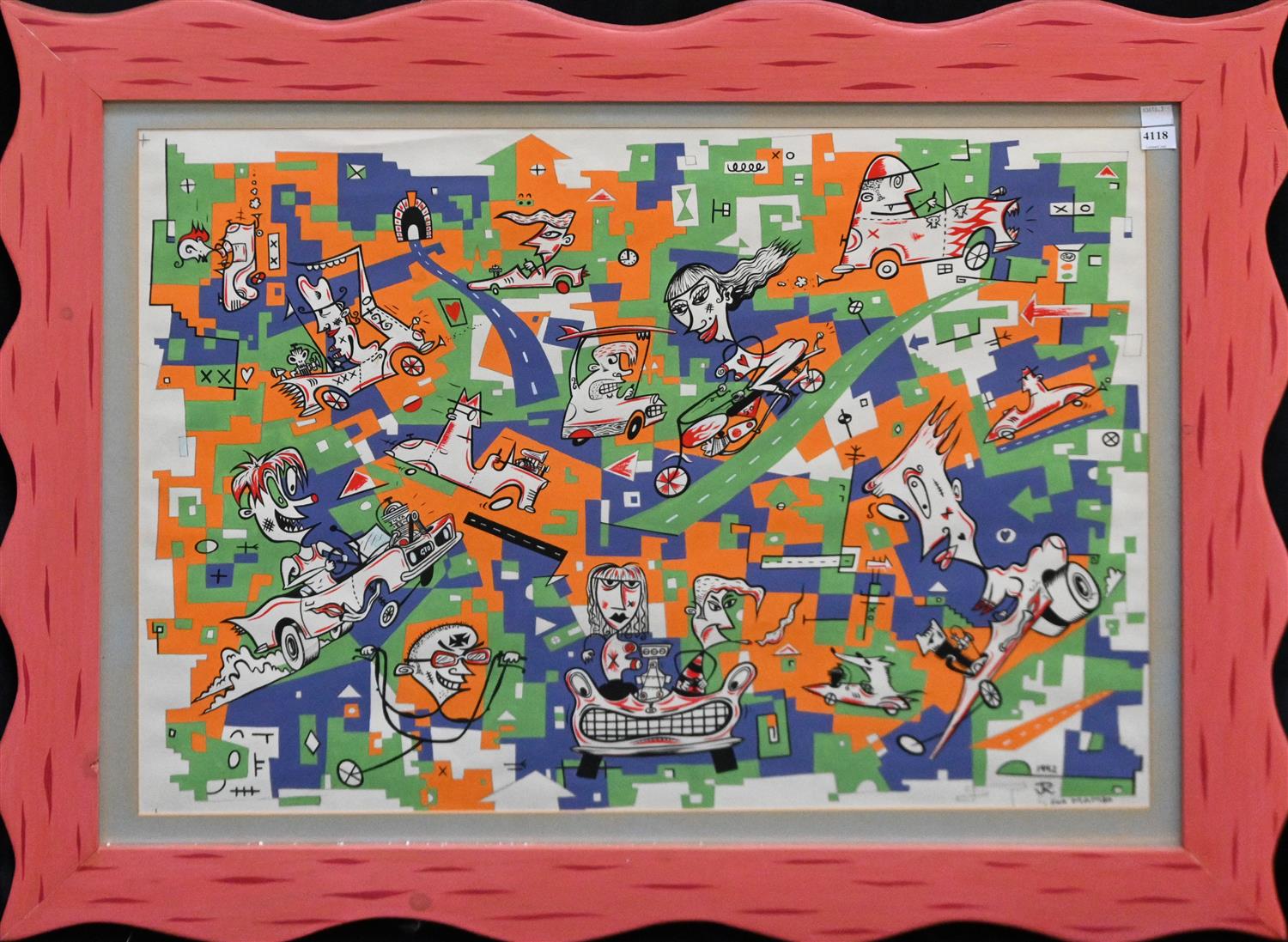 JEFF RAGLUS, HOT ROAD VALLEY FOR MAMBO GRAPHICS 1992, GOUACHE AND INK ON PAPER, SIGNED AND DATED LOWER RIGHT, 54 X 73.5CM (REVEAL), FRAME SIZE: 75 X 95CM