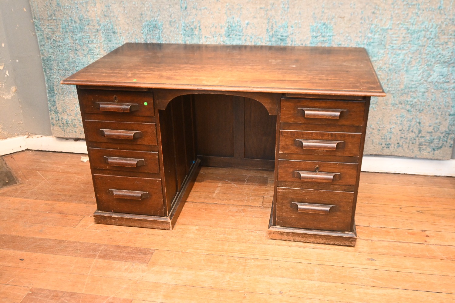 AN EARLY 20TH CENTURY HARDWOOD PEDESTAL DESK (A/F) (77H X 135W X 76D CM) (PLEASE NOTE THIS HEAVY ITEM MUST BE REMOVED BY CARRIERS AT THE CUSTOMER'S EXPENSE. LEONARD JOEL STAFF CANNOT ASSIST CARRYING THIS ITEM) (LARGE ITEM)