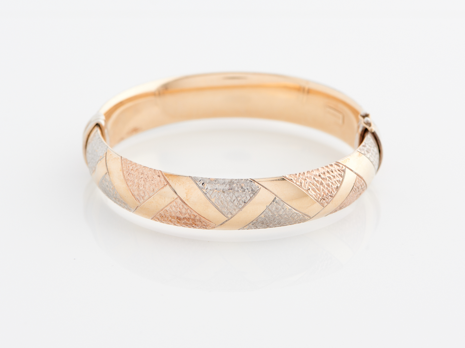 A VINTAGE TEXTURED HINGE BANGLE IN TRI COLOUR SILVER GILT, INNER DIAMETER 65MM