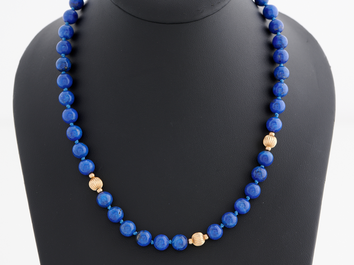 A STRAND OF LAPIS LAZULI BEADS, TO A CLASP IN 9CT GOLD, LENGTH 450MM