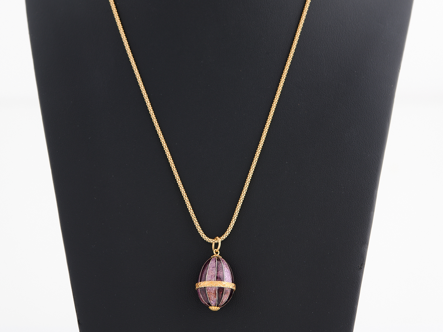 A VINTAGE ENAMELLED EGG STYLE PENDANT IN SILVER GILT, TO A CHAIN IN SILVER GILT