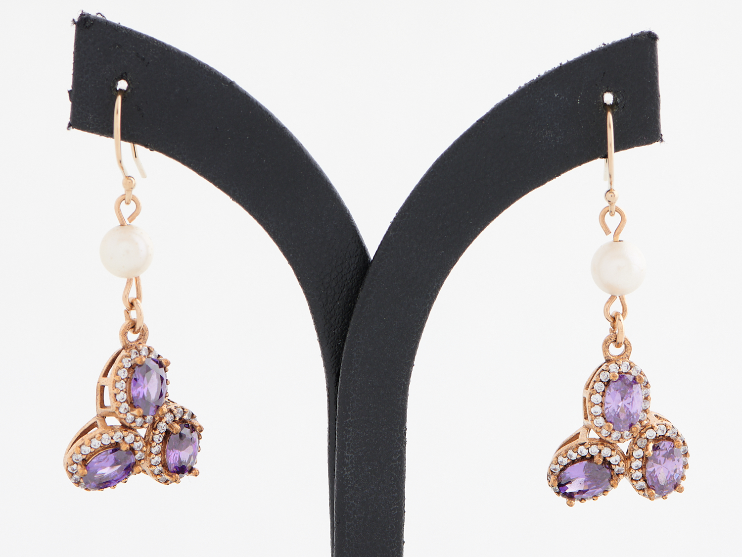 A PAIR OF CULTURED PEARL AND GEM SET EARRINGS IN SILVER GILT, TO SHEPHERDS HOOK FITTINGS