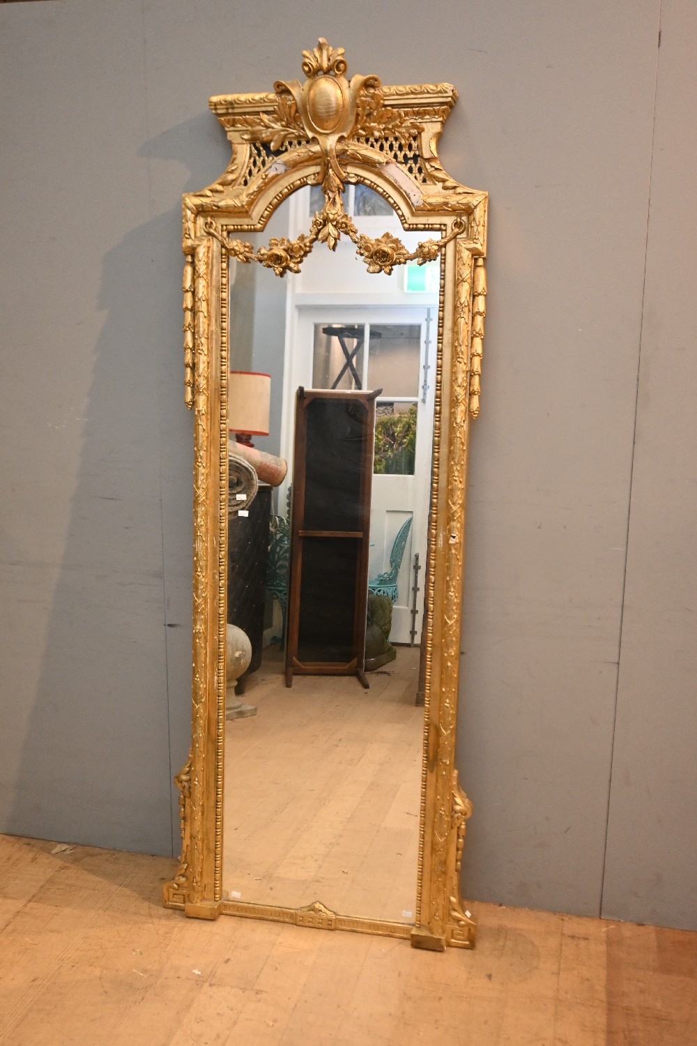 A LATE 19TH CENTURY SUBSTANTIAL GILT OVERMANTLE MIRROR (A/F- LOSSES OVERALL AND SUBSTANTIAL BREAK TO CREST- PIECES PLACED TOGETHER FOR PHOTOGRAPH) (198H X 68W CM)(PLEASE NOTE THIS HEAVY ITEM MUST BE REMOVED BY CARRIERS AT THE CUSTOMER'S EXPENSE. LEONARD JOEL STAFF CANNOT ASSIST CARRYING THIS ITEM) (LARGE ITEM)
