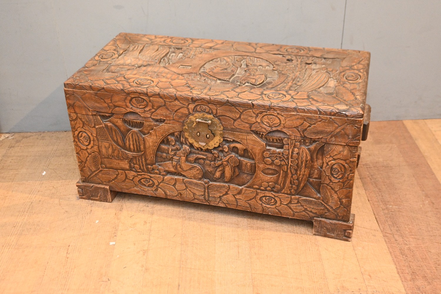 A CHINESE CARVED CAMPHORWOOD CHEST (45H X 44W X 93D CM) (PLEASE NOTE THIS HEAVY ITEM MUST BE REMOVED BY CARRIERS AT THE CUSTOMER'S EXPENSE. LEONARD JOEL STAFF CANNOT ASSIST CARRYING THIS ITEM) (LARGE ITEM)