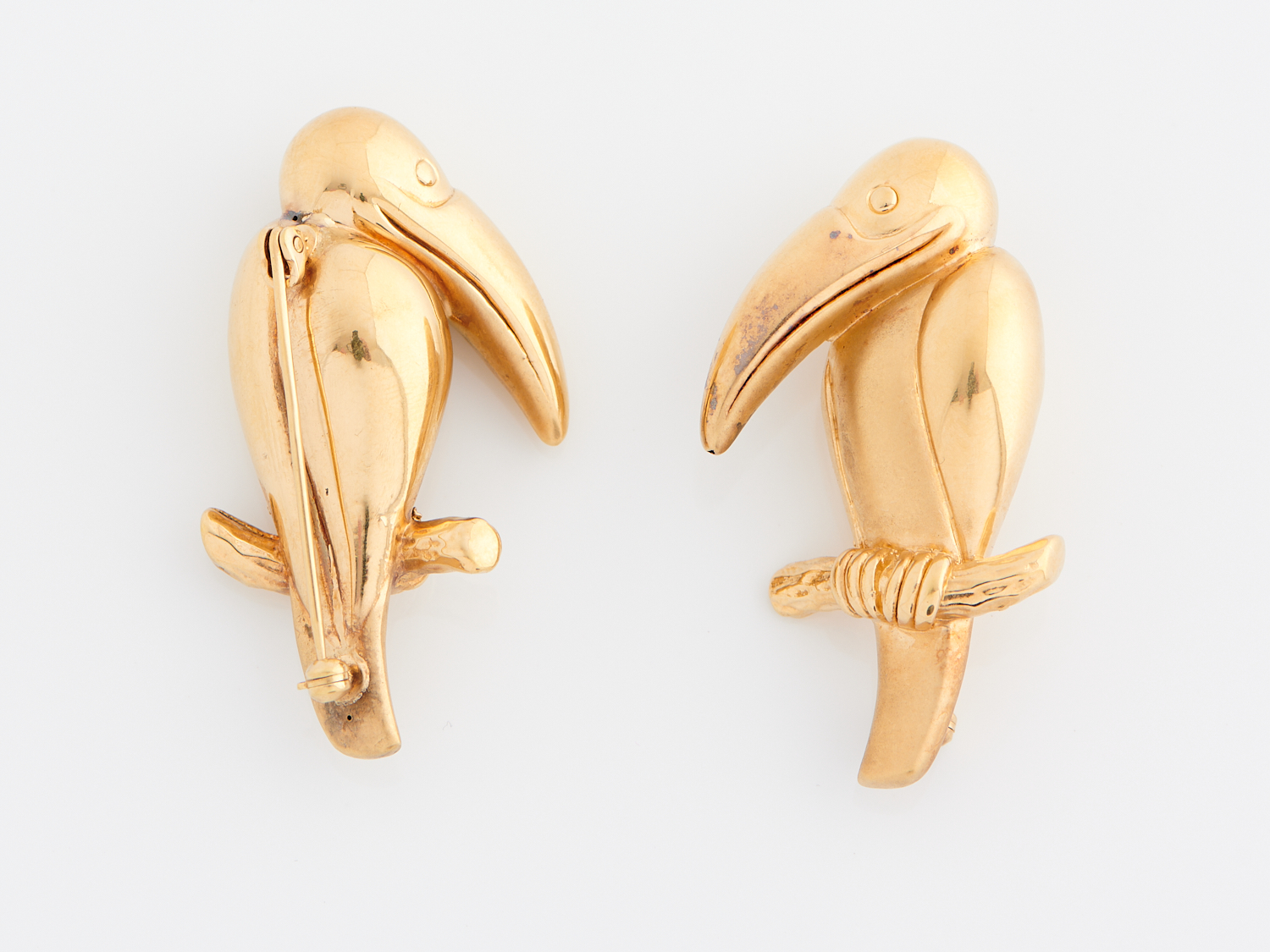 A PAIR OF TOUCAN BROOCHES IN 9CT GOLD